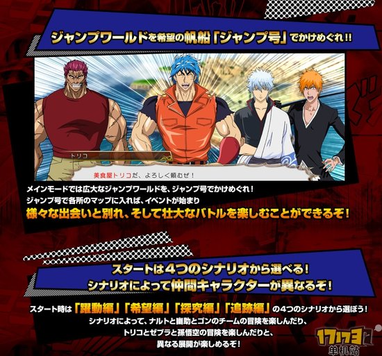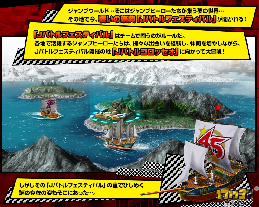 在本作中将有各种游玩模式,例如这次介绍的就是集聚JUMP英雄的“J 战斗祭典”。JUMP WORLD是一个集合了许多JUMP英雄的梦幻世界,在这里就要举办“J 战斗祭典”,大会的规定是以小组进行战斗,在各地活跃的JUMP英雄们将经过各种相遇增加伙伴,乘着希望的帆船“JUMP号”向着活动举办场地“J Battle 斗兽场 ”出发。