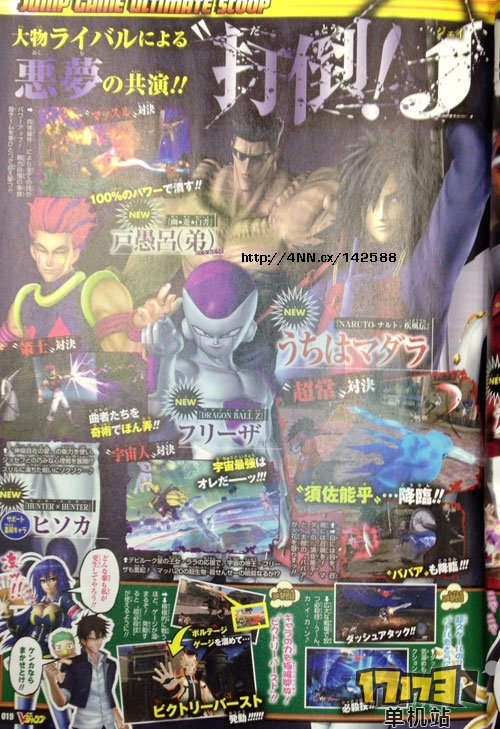 本周杂志图情报更新《JUMP全明星大乱斗V(Jスターズ ビクトリーバーサス)》新情报,除了宿敌新成员增加,来自《全职猎人》的西索将作为辅助角色登场,而来自《幽游白书》的户愚吕(弟)则作为战斗角色参战,另外昨日杂志剪影中还曾有来自《死神BLEACH》的蓝染惣右介,情报提到确认参战,暂时无图。