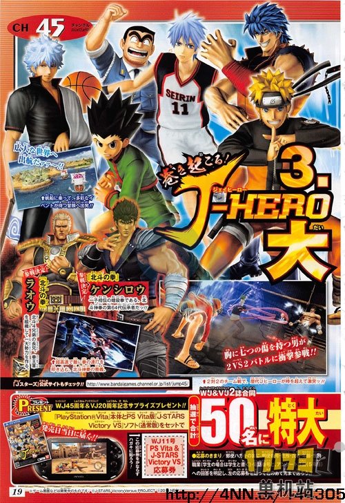 《JUMP全明星大乱斗V》作为JUMP的45周年纪念作品,将于2014年3月19日登陆PSV和PS3双平台,售价为PS3通常版7980日元(含税),PSV通常版6980日元(含税)。