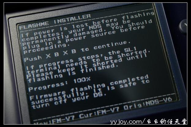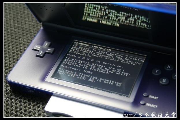 当然,在刷机过程中会可能出现进度停住的现象,那时候就可以是SL1没有短接好,注意再次短接就可以继续让进度走动。进度走动到100%也就是意味着刷机完成了,在进度走到100%前千万不能关机,否则NDSL极有可能变砖头!