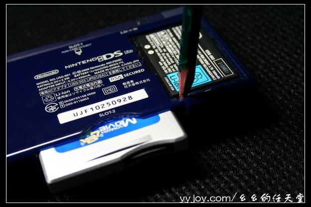 按下“XBXB”后,就会出现一个进度提示,初期是0%,这个时候可以就需要用铅笔或者金属起子将NDSL的SL1短接了,在这里还要专门给大家讲一下NDSL的SL1,于NDS不同,NDSL的SL位置稍微变化了一下,现在移动到电池仓的下方,看到左边的两个小孔了吗?最左边那个小孔就是SL1了,刷机的时候需要用导电物品将其短接起来,这样才能够让进度开始走动,否则一直停留在0%可是刷不了机的。