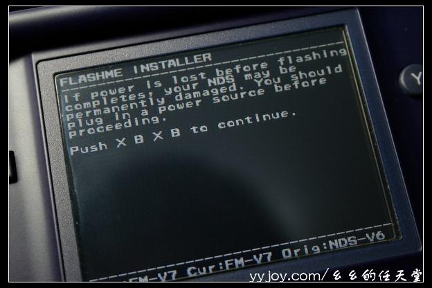 进入了FLASHME程序,首先可以看到“DS LITE”的字样,说明这个是NDS LITE的专用版,此外在屏幕下方还可以看到关于FLASHME以及NDSL固件版本的提示,确定一切没有问题后,按下“XBXB”开刷!