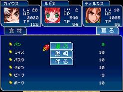 由于行动在战斗开始后便无法变更,所以战斗之前一定要仔细考虑后进行设定。 《传说》系列每作必有的料理系统在《风雨传说》中当然也会登场。食谱和必要的材料组合便可以做出好吃的料理,而吃掉不同的料理也同样会产生各种不同的效果。而作为NDS主机上的本作,将会利用触摸屏来进行料理的制作,乐趣倍增。