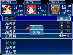 能够进行“兽人化”的角色,可以在战斗菜单中登陆“兽人化”指令。登陆后便可以在战斗中选择该指令,并通过消耗TP进行变身。