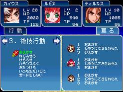 战斗中操作角色以外的其它角色将进行自动战斗。玩家可以在菜单画面设定角色的行动方针,其分为“行动”(攻击和防御的比率)、“目标”(攻击敌人的方针)和“术技行动”(特技和术等的使用程度)3大类,每大类都可以进行详细的设定。