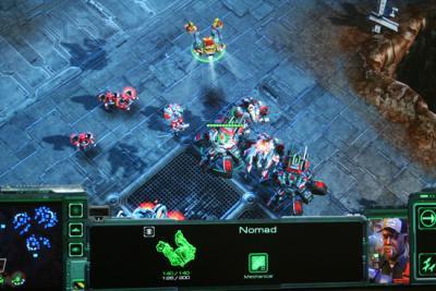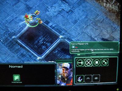 很多细节不少文章提到过,在此重复一下。1、Nomad游牧者飞船作为科技球的替代者,游牧者拥有反隐形、EMP振荡波、防御矩阵以及维修能力。有趣的是,游牧者的驾驶员和SCV驾驶员相同,都是那位叼着烟头的大叔。另外,游牧者的维修技能不止针对空中机械单位,以下图片展示的就是游牧者维修坦克