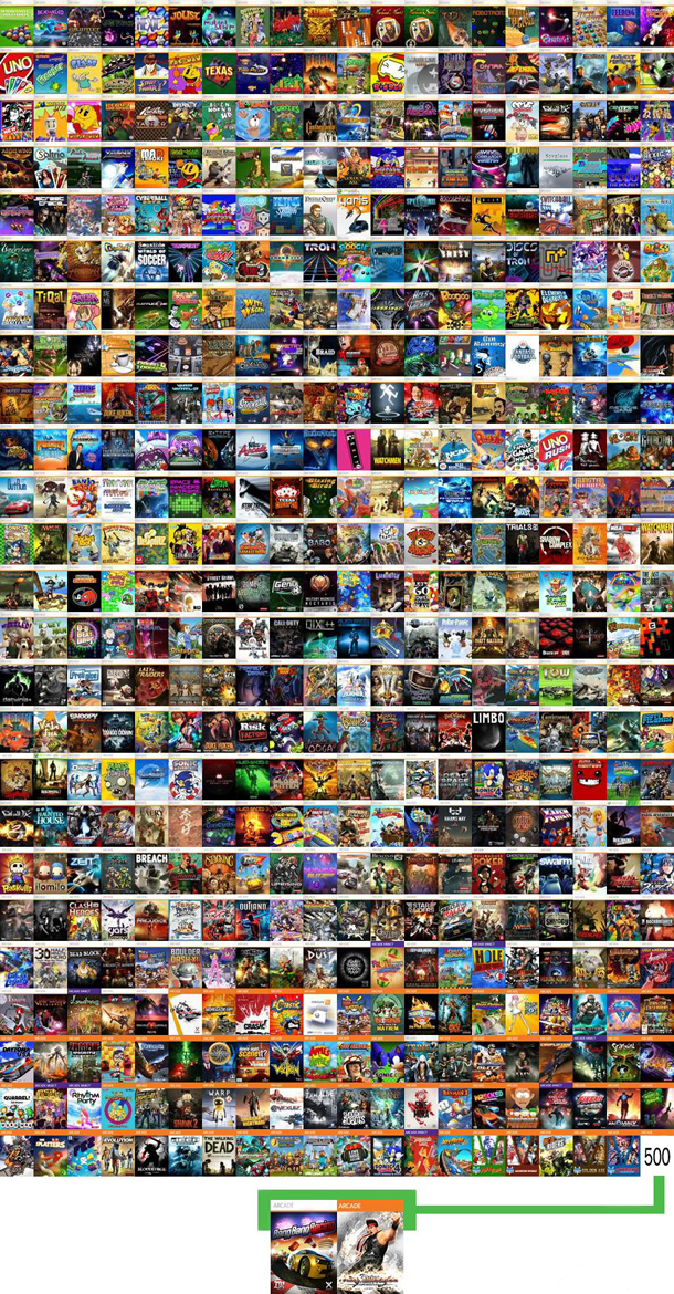 在E32012的喧嚣之后,微软XboxLiveArcade悄悄的迎来了自己的一个里程碑时刻,XBLA平台总游戏数达到了500款,国外游戏媒体制作了下面这张汇集了全部500款XBLA游戏封面的图,但是其中却也犯了一个小小的错误,在这五百张游戏封面图中错误的收录了《1VS100