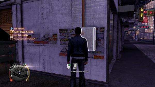 不要高兴的太早了,后面还有一些任务,跑到这个监控管理器旁边,干掉些许小混混后(戴头盔的就用F键秒杀)开始破解密码。密码非常简单,随机输入4个数字,红色的为错误,黄色为放错地方了,绿色为正确。