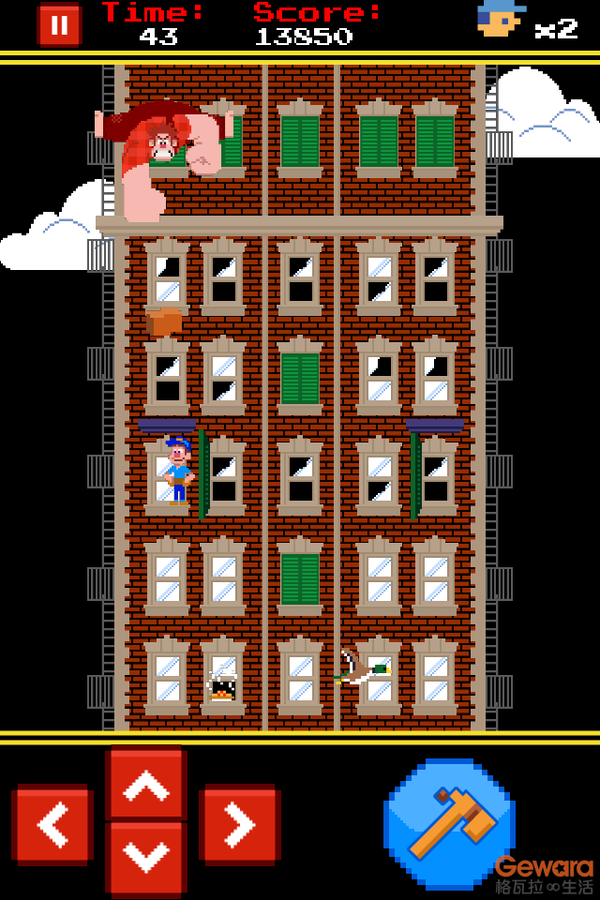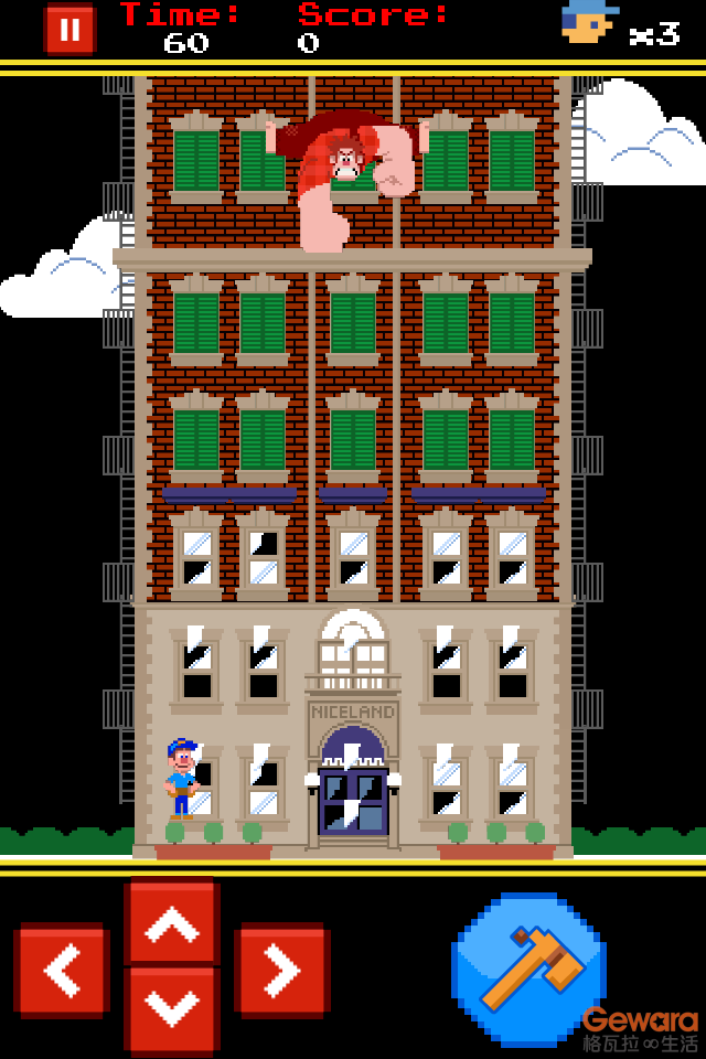 开头中的游戏《Fix-itFelix》(快手阿修)是80年代早期风格的街机游戏,二维还不带卷轴,相当古典啊~这个游戏我查过是虚构的,全为游戏故事设定而设计。要找一个同期最有名的类似游戏,大概算是《CrazyKong》(后来的FC移植作相信很多人都玩过《大金刚》,里面也出现
