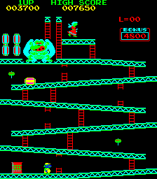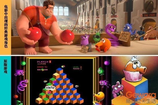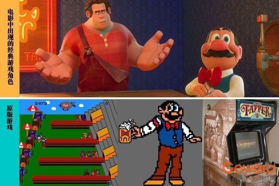 开头中的游戏《Fix-it Felix》(快手阿修)是80年代早期风格的街机游戏,二维还不带卷轴,相当古典啊~ 这个游戏我查过是虚构的,全为游戏故事设定而设计。要找一个同期最有名的类似游戏,大概算是《Crazy Kong》(后来的FC移植作相信很多人都玩过《大金刚》,里面也出现了玛丽哥)。不过当年机房里此类游戏的画面绝对算不上惊艳,比电影里的画面差多了。因为采用Z80处理器的游戏主板最多也就呈现32位色了。