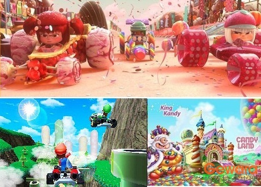 赛车游戏在世界观上参考了HASBRO孩之宝公司的桌游CANDYLAND,在游戏内容方式上则是完全的《马里奥卡丁》。不要和我说跑跑卡丁车神马滴,80年代人都知道SFC的马里奥卡丁才是此流的正统,至今在游戏性上都是最佳的。涡轮冒充的国王所用的道具完全就是马里奥卡丁里的红色龟壳三连发嘛,云妮罗普在电影过程中施展的加速,场景飞越都和原游戏中如出一辙。据我所知,南梦宫和任天堂一同开发的马里奥卡丁车街机版在美国的市场投币率也一直不错,想来美国人对马里奥人物系列游戏是有相当的感情的。可惜这次由于版权原因,马里奥大叔没有出场,只有在破坏王来派对搅局时才被人揄耶了一回。