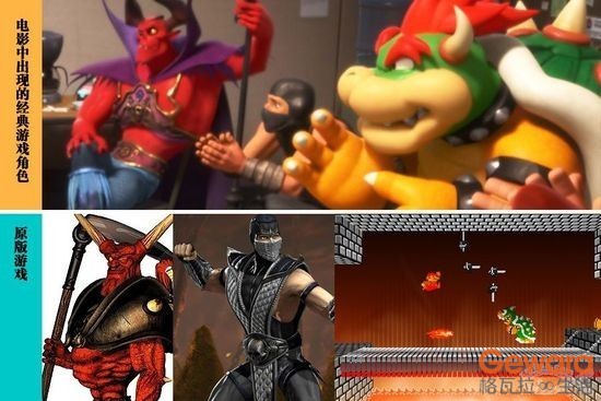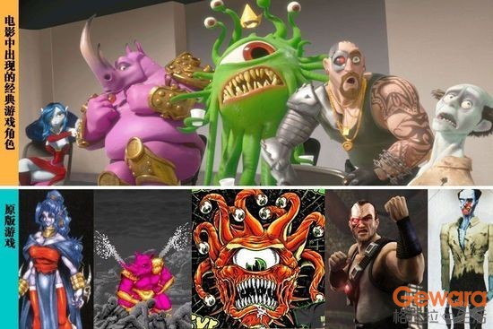 左起《光明力量(SHIINING FORCE)》第六章中的关底BOSS女巫Mishaela、《兽王记(Altered Beast)》中的Neff、《偷窥之眼(Eye Of Beholder)》中的主角、《真人快打(Mortal Kombat)》中的KANO、《死亡之屋(The House of Dead)》中的僵尸Cyril。其中比较有趣的是僵尸Cyril,他在电影中一直滔滔不绝的诉说着自己做坏人的苦闷。(这几个角色前两个不怎么熟悉,我还以为那个犀牛是忍者神龟里的,僵尸哥倒是演得有模有样的,鬼屋1,2两代里似乎都有出镜)
