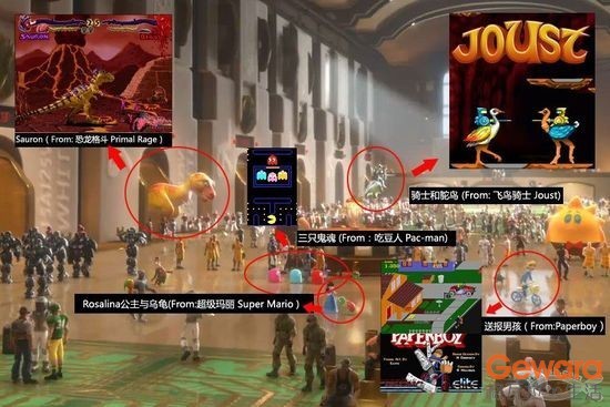 采用大个拖线板为原型的中央火车站是游戏人物的集中地,这里大家也可以看到大批的游戏角色,多到傻眼。镜头闪过中央大厅都在来回转悠的大恐龙是《恐龙格斗(Primal Rage)》里的Sauron,远处溜达的骑士一样的人是《飞鸟骑士(Joust)》,还有《卖报男孩》和《超级玛丽》里蓝裙子的Rosalina公主正在和乌龟聊天。还有《挖地打气(DigDug)》里那个白色的小人儿和PACMAN中的三个鬼魂。其他我还能辨认出的是EA出品的NFL游戏。那个黄色大胖太阳不知是什么。。。据迪士尼影业透露,这里有多达128个游戏著名人物的出现,究竟都有谁,就要靠你到电影院里自己认认看了。