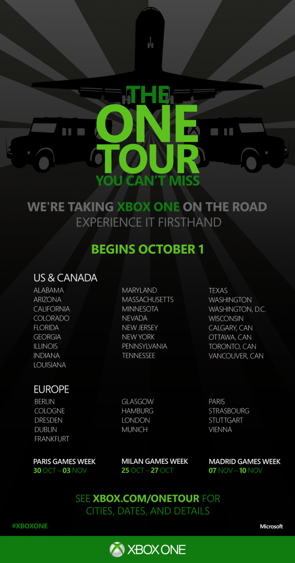 距离Xbox One在全球13个市场的发布已经不到2个月的时间,而今天,微软宣布,其将在加下去的数周里,于美国、加拿大、以及欧洲的75个城市,举办大规模的Xbox One巡展。尽管人们要等到11月22日才能买到,但是微软的巡展可以让更多的人们提前领略到Xbox One的魅力。本此巡展将从10月1号开始,并且会有两种形式。